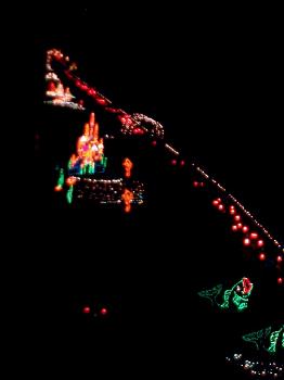 The view from our 6th floor hotel room. The row of staggered red lights are actually automobile tail lights along the board walk. The display in the center of the picture can be seen close up on the next page.