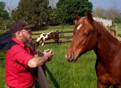 Late summer flowers within Manassas National Battlefield Park are lighted through a break in the clouds during one of the many rainless cloudy days of this season. Frank's digital camera really performed beautifully for this shot. It has been one of his favorite computer wall papers this year. On the right, Frank becomes friends with a local resident of Luray. The friendship was short lived. When the horse concluded Frank didn't have any tasty treats, he went back to munching the grass.