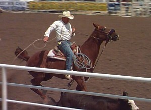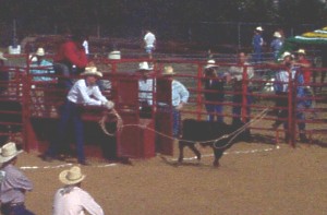 As in calf roping, team roping had its origins on the ranch when it became necessary to "doctor" large livestock on the open range. In this event, two cowhands work as a team to rope and stretch a steer jointly in the fastest possible time. The "header" leaves the box first and throws a loop over the steer's horns while turning the steer away from his partner, the "heeler". The heeler then throws a rope to catch both back legs. Then, each rider pulls the ropes taut and time is called. Each team is allowed a total of three ropes should a toss miss. If the "heeler" only catches one rear leg in the loop, the team incurs a 5-second time penalty. With hours of practicing spent perfecting their timing, competitive team ropers are exciting to watch as they and their skilled mounts complete these catches in a matter of seconds. Fastest time wins. | |