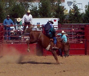 Bareback Bronc Riding Bareback Bronc Riding is an event that pits the contestant against 1100 lbs. of muscle and mean for a six-second ride. The bucking horse carries a "rigging" with a single (or double) hand hold on which the contestant bears down for the ride, without benefit of reins, saddle or stirrups. As in all "rough stock" riding events, both horse and rider are evaluated by two judges each giving up to 50 points for the ride, 25 points available for the horse's bucking pattern and power and 25 points to the rider for form, control and spurring action. Both judges' scores are combined for a maximum 100 points on a qualified ride. Disqualifications for this event are a buck off before the six-second whistle or the touching of the horse, equipment or self by the free hand of the contestant making the ride. |