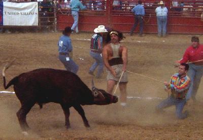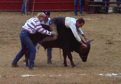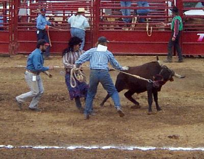This is one of the funniest events to watch in Gay Rodeo. This event consists of teams of three people: one male, one female and one person in drag (women's clothing). The steer begins in the chute with a halter and a rope. The cowgirl holds the end of the rope from behind the 10 foot line. | |