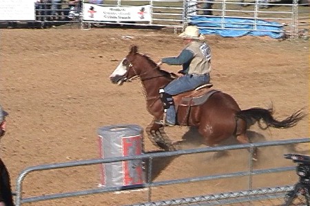 Contestants vie for the fastest time running a cloverleaf pattern around three barrels set in a triangle. Horse and rider are allowed a running start. Time begins and ends upon crossing the starting line. A five-second penalty is assessed for knocking over a barrel. Disqualification takes place if horse and rider break the pattern. The pattern can be started to the right or left. The fastest time wins.