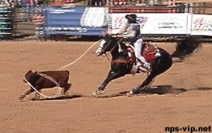 | Breakaway Calf Roping From range to arena, calf roping is the oldest of rodeo's events. It came about from the necessity of the cowhand to be able to do "doctoring" on the range and to handle roping duties at the "branding". Though no longer on the range, the roper now tests his/her roping skills against the clock. A timed event, breakaway calf roping is a contest between a quick, agile calf and a skilled roper mounted on a lightning-fast highly trained horse. The contestant calls for the animal and the calf leaves the chute. The contestant then ropes the calf and releases the rope which is tied with a string to the horn of the saddle. Once the calf pulls the slack out of the rope and pulls hard enough to break the string, the judge will drop the flag stopping time. The fastest time wins. This is the IRGA's version of regular rodeo's lassoing the calf, yanking it to the ground, and tying 3 of its legs together. Much easier on the calf, don't you think? Sorry no video available. |