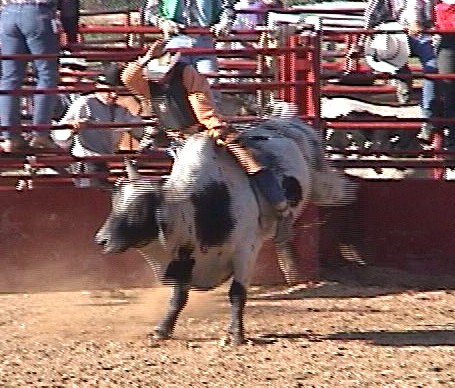 One of rodeo's most prominent events, bull riding is also the most exciting and favorite spectator event of rodeo. Bull riding has the added factor of danger for the contestant in swinging his/her leg over an unpredictable bull that may decide to come looking for him/her after the ride. Erratic and violent in their twists and leaps, these bulls require the stoutest of contestants to stay with them until the six-second signal. As in most rough stock events, contestants ride with only one hand. Touching of the bull or self with the free hand or a "buck off" is a disqualification. In this event, the contestant maintains position by hanging on to a heavy rope that encircles the bull. Bull riding is scored by two judges each giving up to 50 points for the ride, 25 points possible for the bucking pattern and power of the bull and 25 for the form, control and spurring action of the rider. Both judges scores are combined to total a maximum 100 points for a qualified ride.