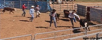 Mama's Calf Catch This event was crafted locally in an effort to expand the offering of so called camp events. Up to eight two-person teams congregate at a start-finish line at one end of the arena where they are given a poker chip with a number written on it. A group of calves with identically numbered poker chips tied around their necks are released into the opposite end of the arena. A judge whistles the start of the event. Team members then scramble to find the calf in the arena with a numbered chip matching theirs.