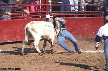 In this event, the contestant stands in a chute with the steer's horns already in hand. Within 60 seconds from the time the chute gate opens, the dogger and the steer must cross a line 10 feet from the gate. The dogger then must wrestle the steer to the ground so that all four of the steer's hooves are pointed in the same direction as the nose, as if the steer were lying down. Once the steer is down, the judge will drop the flag stopping time. The fastest time wins. |