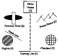 At the starting signal, team members run to their respective homes, Dolly to the White House (2), one team member to Maryland (3), and the other to Virginia (4). On arriving in their home states, Dolly's helpers each don a dress and wig waiting for them, then race to the White House. Each must cross a barrier located in his or her path, a boat on tracks (lower photo) across the Potomac River on the Virginia side (5) and a picket fence across the fields of Maryland (6). Dolly, who has hopefully located her items in the White House trunk, quickly hands them off to the appropriate team member.