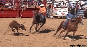 As in calf roping, team roping had its origins on the ranch when it became necessary to "doctor" larger livestock on the open range. In this event, two cowhands work as a team to rope and stretch a steer jointly in the fastest possible time. The "header" leaves the box first and throws a loop over the steer's horns while turning the steer away from his partner, the "heeler". The heeler then throws a rope to catch both back legs. Then, each rider pulls the ropes taut and time is called. Each team is allowed a total of three ropes should a toss miss. If the "heeler" only catches one rear leg in the loop, the team incurs a 5-second time penalty. With hours of practicing spent perfecting their timing, competitive team ropers are exciting to watch as they and their skilled mounts complete these catches in a matter of seconds. Fastest time wins.