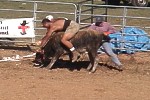 Wild Drag Race This is one of the funniest events to watch in Gay Rodeo. This event consists of teams of three people: one male, one female and one person in drag (women's clothing). The steer begins in the chute with a halter and a rope. The cowgirl holds the end of the rope from behind the 10 foot line. The cowboy and the person in drag are positioned behind a line 40 feet from the chute. When the chute opens, the cowgirl attempts to hold the steer while the cowboy puts the person in drag on the steer's back. The mounted steer must then cross the finish line 70 feet across the arena. If the steer crosses the finish line without the person in drag on its back, the team must get the steer back over the finish line and try again. |