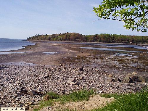 | From another location and the tide completely out, we see the bar completely exposed. Twice each day for several hours one can walk to Bar Island from the mainland. |