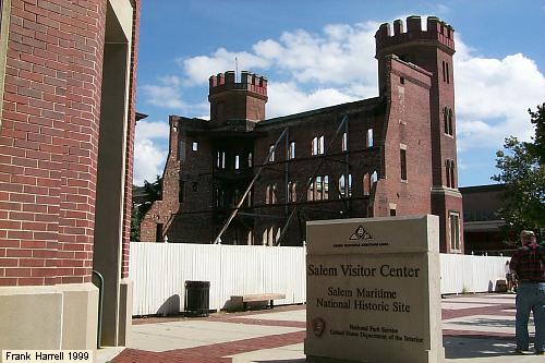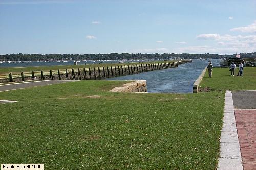 | This is Derby Wharf built in 1762. This, and 2 smaller ones are all that remain of the more than 50 wharves that once lined Salem Harbor. They were covered with dozens of warehouses. Some of the wharves were built by floating timber rafts into position, then sinking them with stones. Others such as Derby Wharf, were constructed of stone exterior walls filled with earth. Derby Wharf is almost a mile long, quite a construction feat for 1762. |